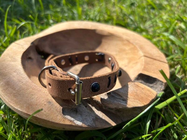 Halsband taupe leer met zwarte studs en donkerblauwe accenten.